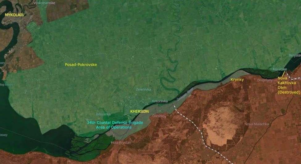 Other small crossings and raids had been conducted, but the Ukrainian Marines landed at Krynky and two other locations as a major operation in October 2023. The primary task was to open a second front and draw Russian troops from Robotyne, but the Russians didn’t have a second line of defense, so if they broke through the first line they were tasked with moving to Crimea. The plan was to secure a 30 km stretch of land from the Antonivka Railway Bridge near Kherson to Krynky and move 5-7 km inland in 3-4 days. Having been exhausted by the fighting at Velyka Novosilka, and marching on foot without heavy equipment, the troops involved felt they might be able to accomplish those tasks with 9-12 brigades, but only three brigades would be crossing with a fourth brigade being held in reserve.