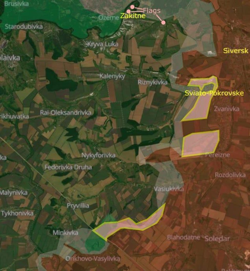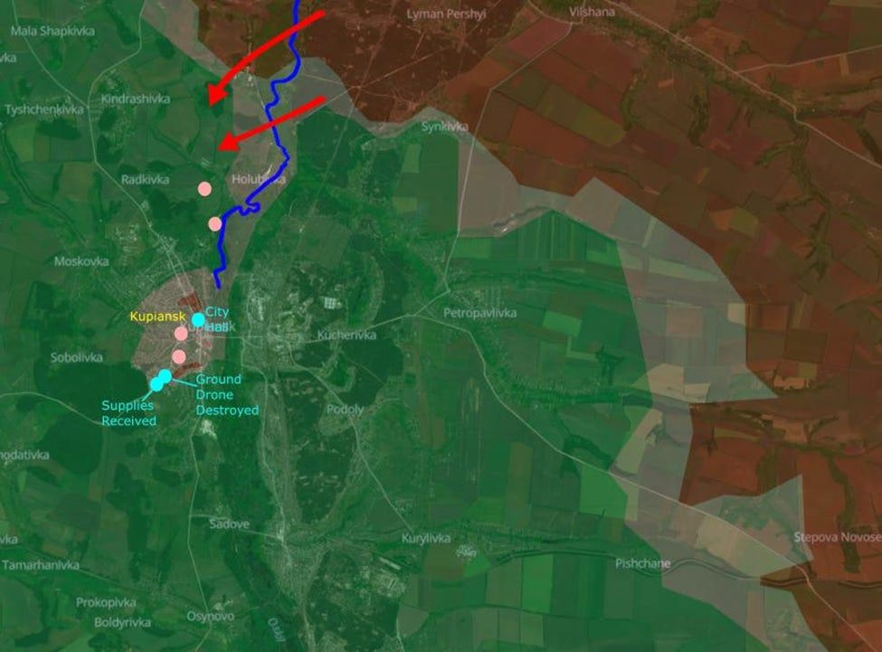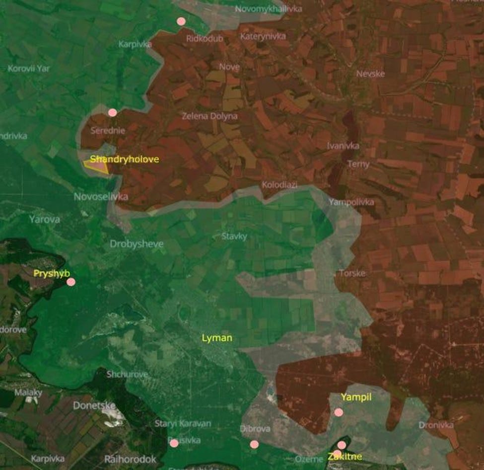 While the VKS has spent much of the last week bombing bridges over the Siversky Donets River - i.e. interdicting the (already meagre) flow of supplies and reinforcements for the ZSU in this sector - Russian thermal cloaks are used to defeat Ukrainian drones hunting at night. A Russian is killed 6 km from the ‘front lines’ near Pryshyb. With Russia taking control of Zakitne, they will soon have full control of Yampil.