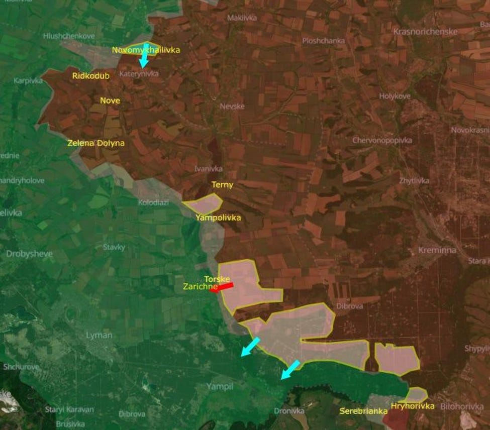 Because of the the Russian advances at Zarichne and Serebrianka, the Ukrainian positions in the forest north of Serebrianka are withdrawing.