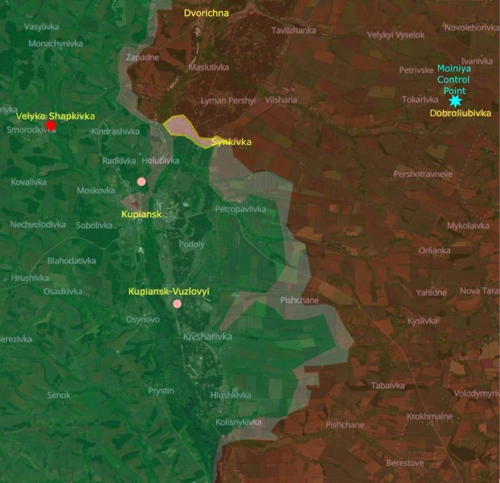Eight Russians were seen in a damaged hospital in Dvorichna. A drone was sent in and collapsed the building. Russians in Kupiansk-Vuzlovyi were attacked. A Russian airstrike in Velyka Shapkivka, 7 km from the front line. The Molniya drone control point was attacked 15 km from the front.