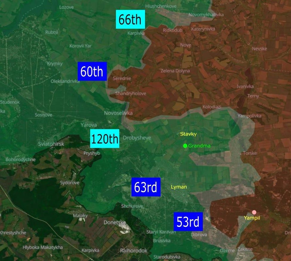 This is from two weeks ago but it shows the terrain around Yampil. This following map is showing the approximate positions of just the southern half of the 3rd Corps sector: one that stretches 60 km in a straight line. The 53rd, 60th and 63rd brigades are part of the 3rd Corps. The 66th and 120th brigades are attached to the corps.