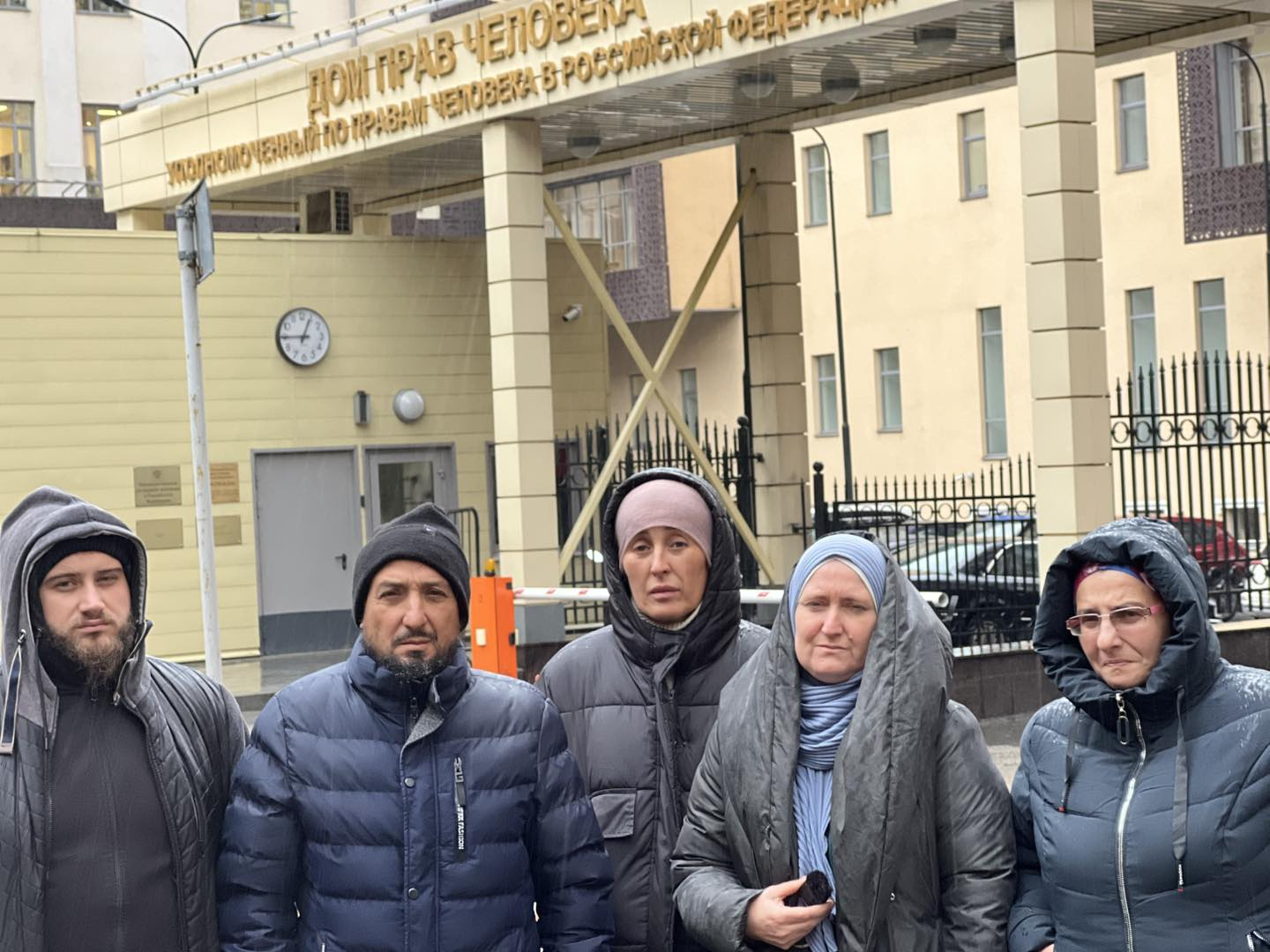 From left to right are the husband and father of Nasiba Saidova, Nazim Saidov and Sadyk Urinbayev, mother of Fevziye Osmanova Eleanora Osmanova, mother of Elviza Aliyeva, Elvira Aliyev and mother of Nasiba Saidova, Dinara Iyupova. In the reception room of the Ombudsman of the Russian Federation. Photo: “Crimean Solidarity” Facebook Page