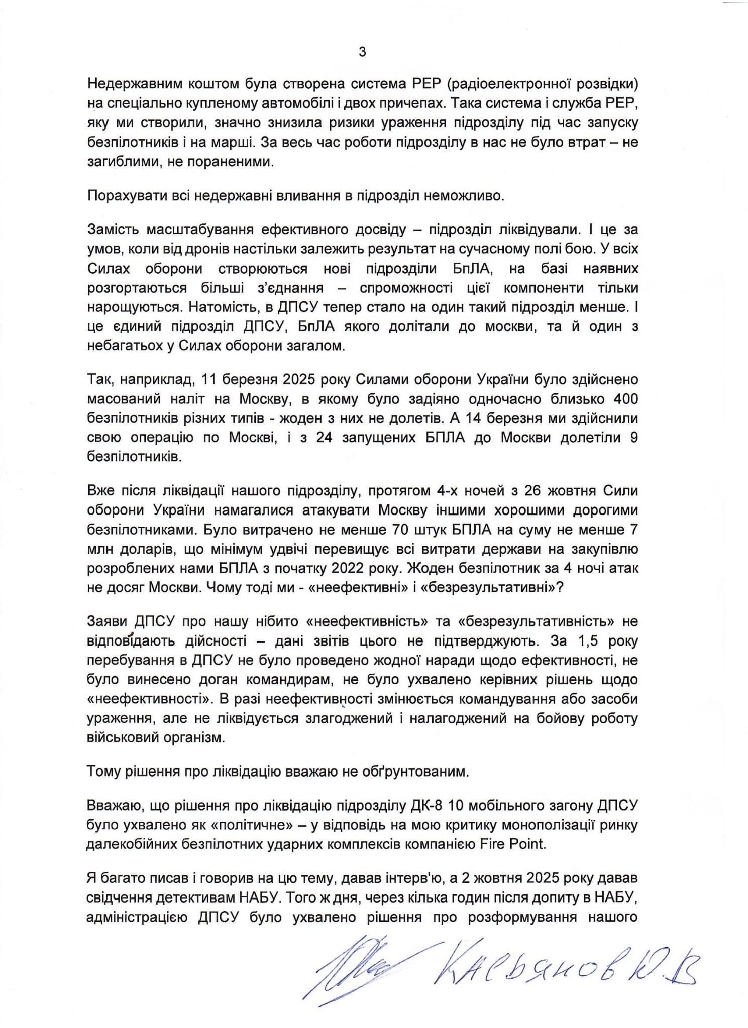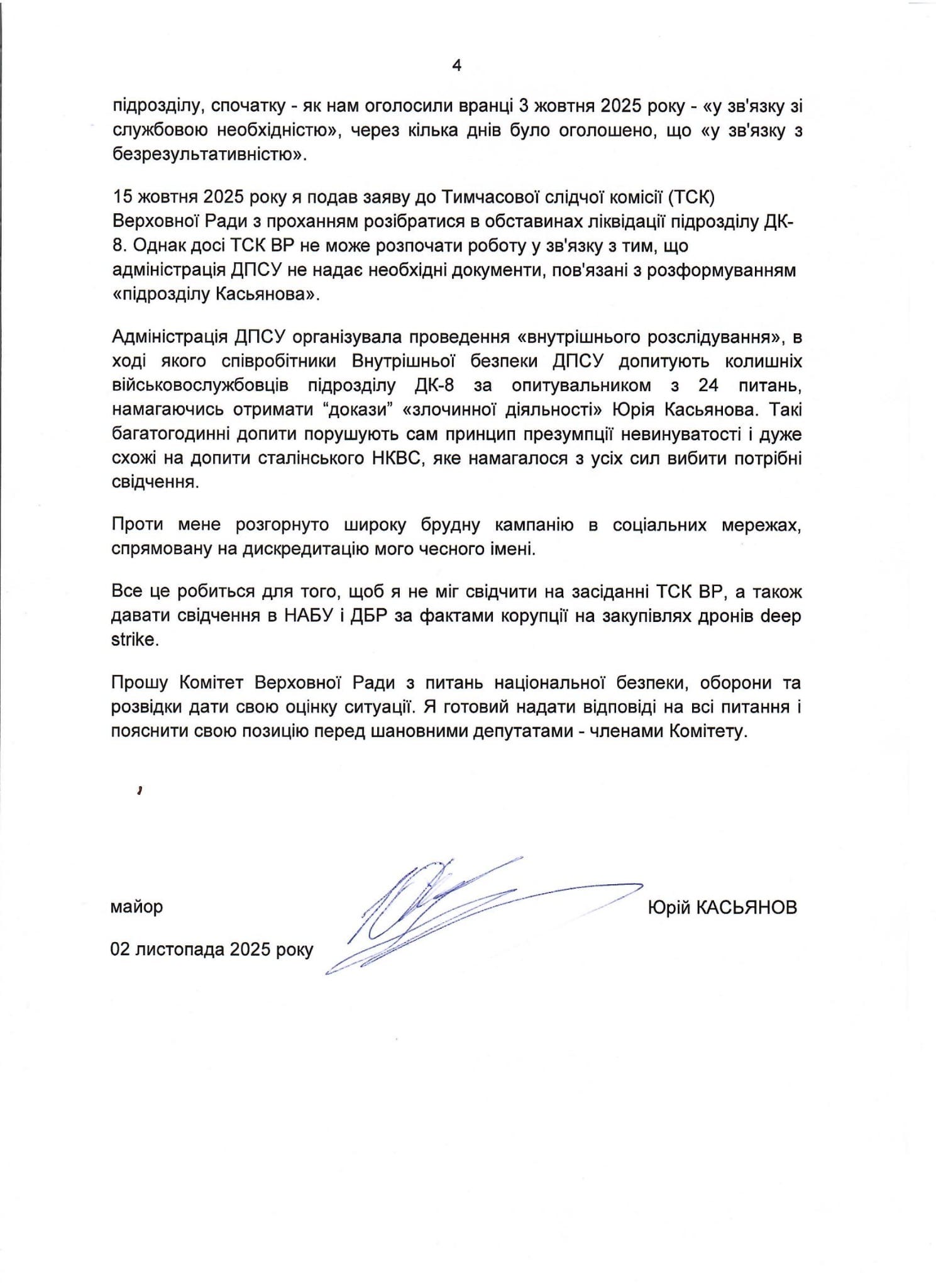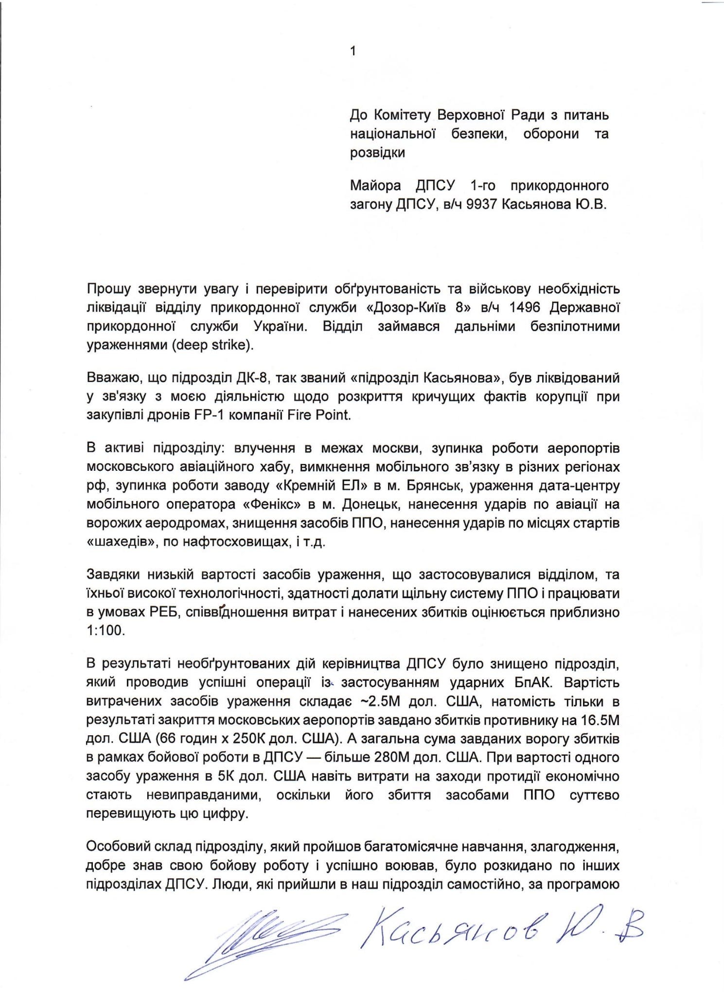 To the Verkhovna Rada Committee on National Security, Defence and IntelligenceMajor of the State Border Guard Service of Ukraine, 1st Border Guard Detachment, military unit 9937, Y.V. Kasyanov I request that you review and verify the validity and military necessity of the liquidation of the border guard unit ‘Dozor-Kyiv 8’ military unit 1496 of the State Border Guard Service of Ukraine. The unit was engaged in deep strike operations.I believe that the DK-8 unit, the so-called ‘Kasyanov unit’, was liquidated in connection with my activities to expose blatant corruption in the procurement of FP-1 drones from Fire Point. The unit’s achievements include: strikes within Moscow, shutdown of airports in the Moscow aviation hub, shutdown of mobile communications in various regions of the Russian Federation, shutdown of the Kremniy EL plant in Bryansk, damage to the data centre of the mobile operator Phoenix in Donetsk, strikes on enemy airfields, destruction of air defence systems, strikes on launch sites for suicide bombers, oil depots, etc.Thanks to the low cost of the weapons used by the unit and their high technological sophistication, ability to overcome dense air defence systems and operate in electronic warfare conditions, the ratio of costs to damage inflicted is estimated at approximately 1:100. As a result of the unfounded actions of the State Border Service leadership, the unit that carried out successful operations using strike UAVs was destroyed.
