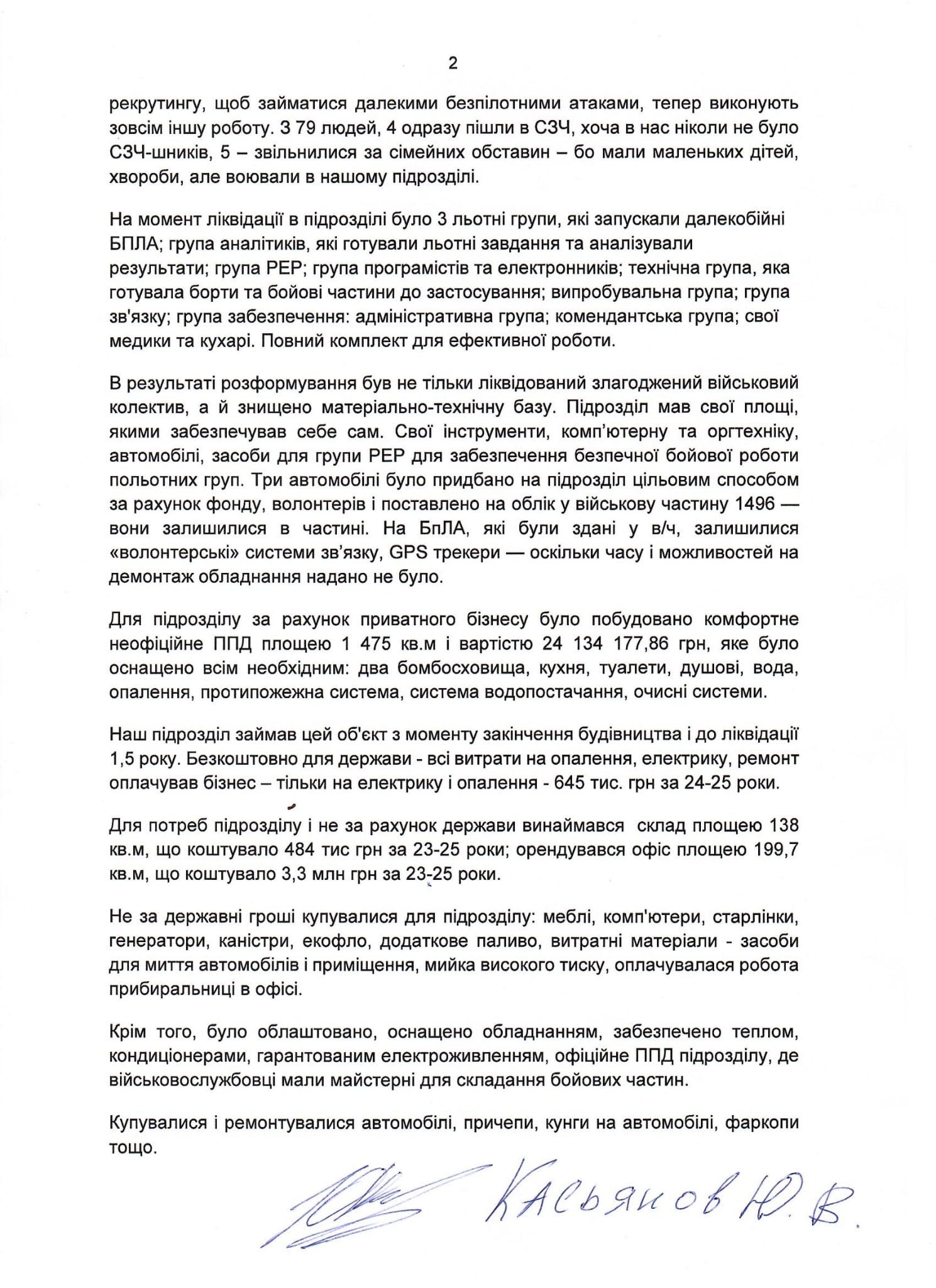 Вважаю, що підрозділ ДК-8, так званий «підрозділ Касьянова», був ліквідований у зв’язку з моєю діяльністю щодо розкриття кричущих фактів корупції при закупівлі дронів FP-1 компанії Fire Point.